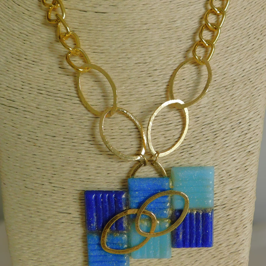 This multi-faceted necklace has gold metal links on a gold-plated chain. The various tiles are gathered to make a beautiful pendant.